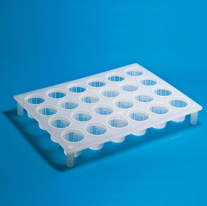 MULTIFORME composta da 1 Piastra mm. 700 x 500 x 15 munita di appoggi e provvista di 24 fori (4x6) per forme ø mm. 95 x h. 70 cod. P00678 e fuscelle ø mm. 95 x h. 70 cod. P00665 a perdere